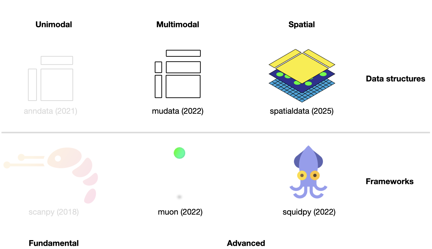 Fig. 5.1 Scverse ecosystem overview highlighting the libraries of this chapter. The publication date by a scientific journal is shown in brackets. We have obtained the symbols of the libraries from the corresponding Github pages [Bredikhin et al., 2022, Marconato et al., 2025, Palla et al., 2022, Virshup et al., 2021, Wolf et al., 2018].#