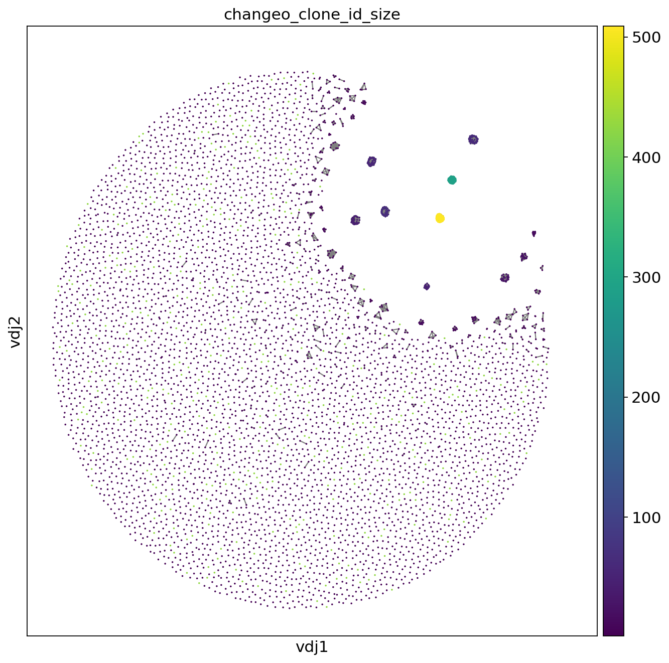 Compared to Scirpy, the clonotypes visualization in Dandelion does not show their sizes (number of cells). This process should be done separately, i.e., first, it is necessary to calculate the size of the clones and transfer this information to the annData object to perform the visualization via Scanpy.