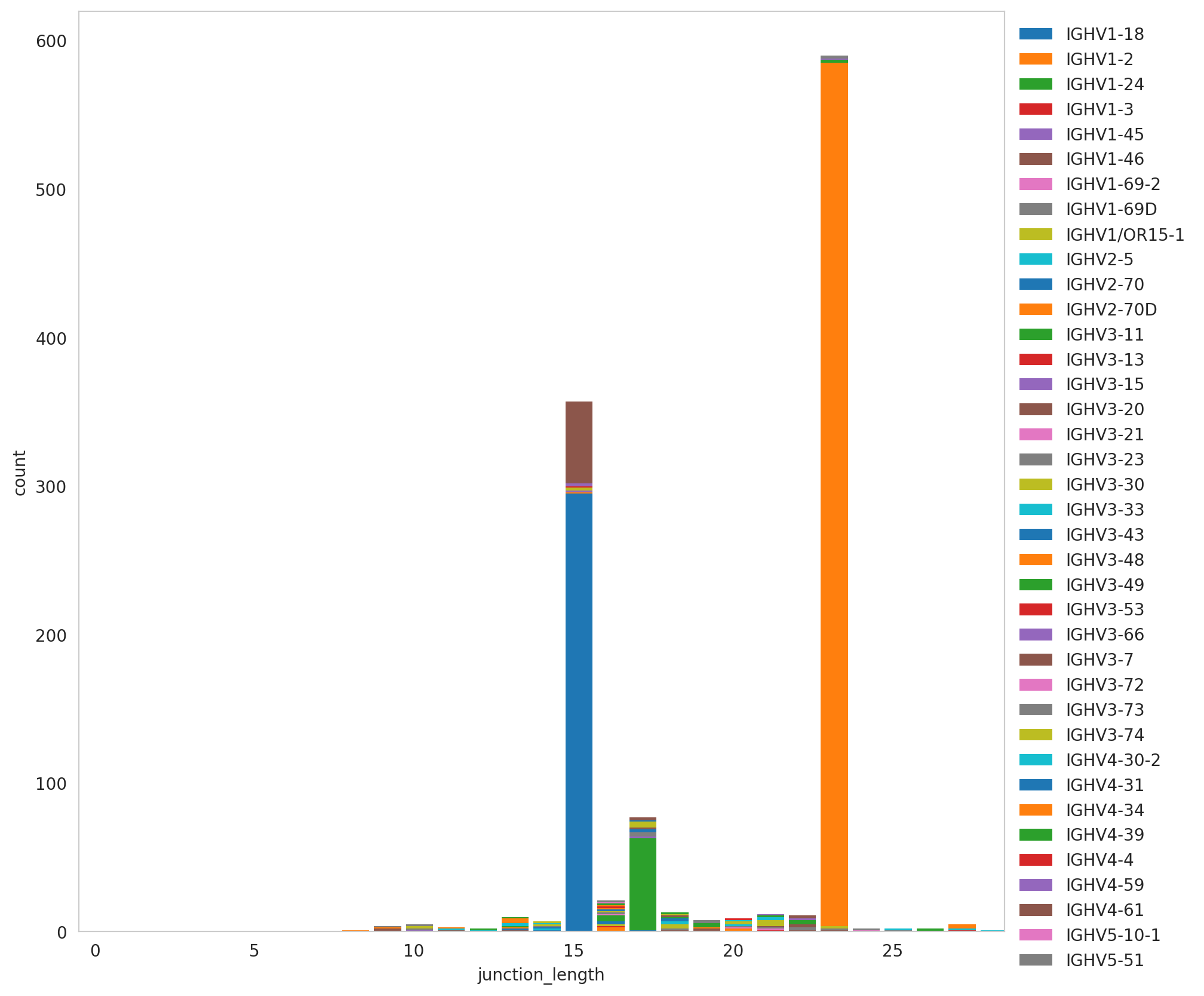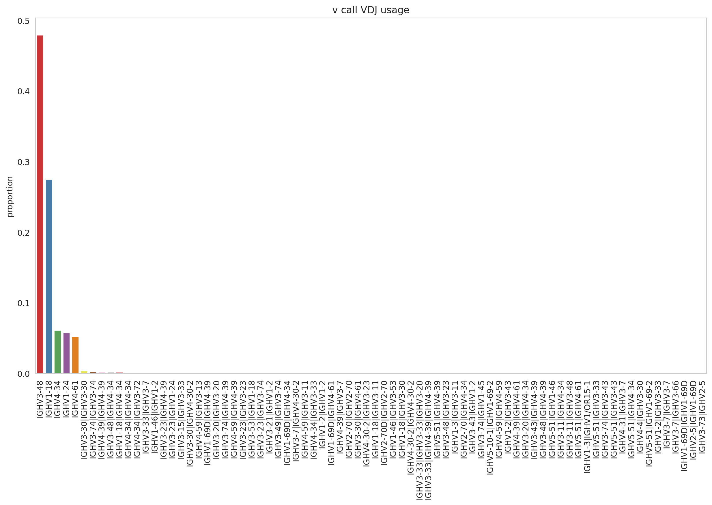 As you can appreciate before, IGHV3-48 and IGHV1-18 were the gene segments consistently more abundant in comparison to the rest of the segments in the plot, providing evidence of strong V gene preferential usage for the samples analyzed here.