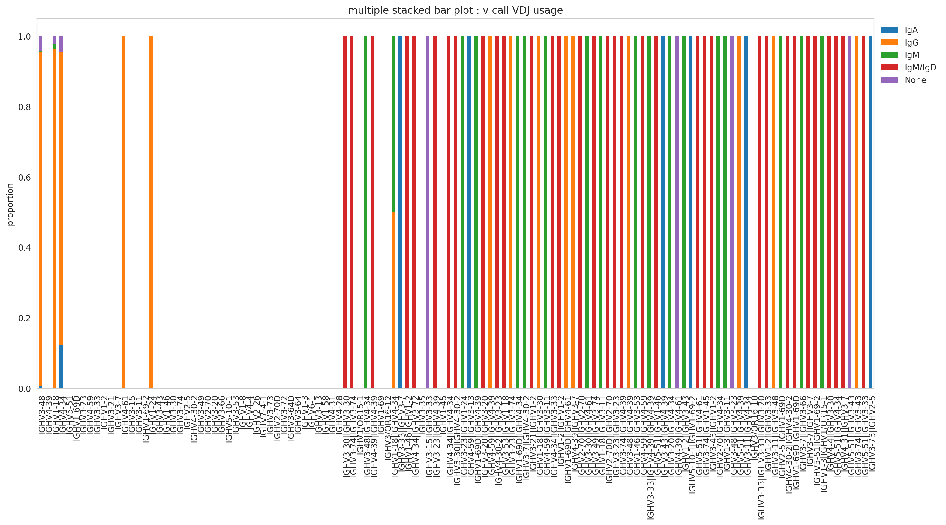 The plot above showed that IgG mostly used the V segments IGHV3-48 and IGHV1-18. It could be due to IgG being the isotype most expanded. Therefore, it masked the gene segment usage from the rest of the isotypes.