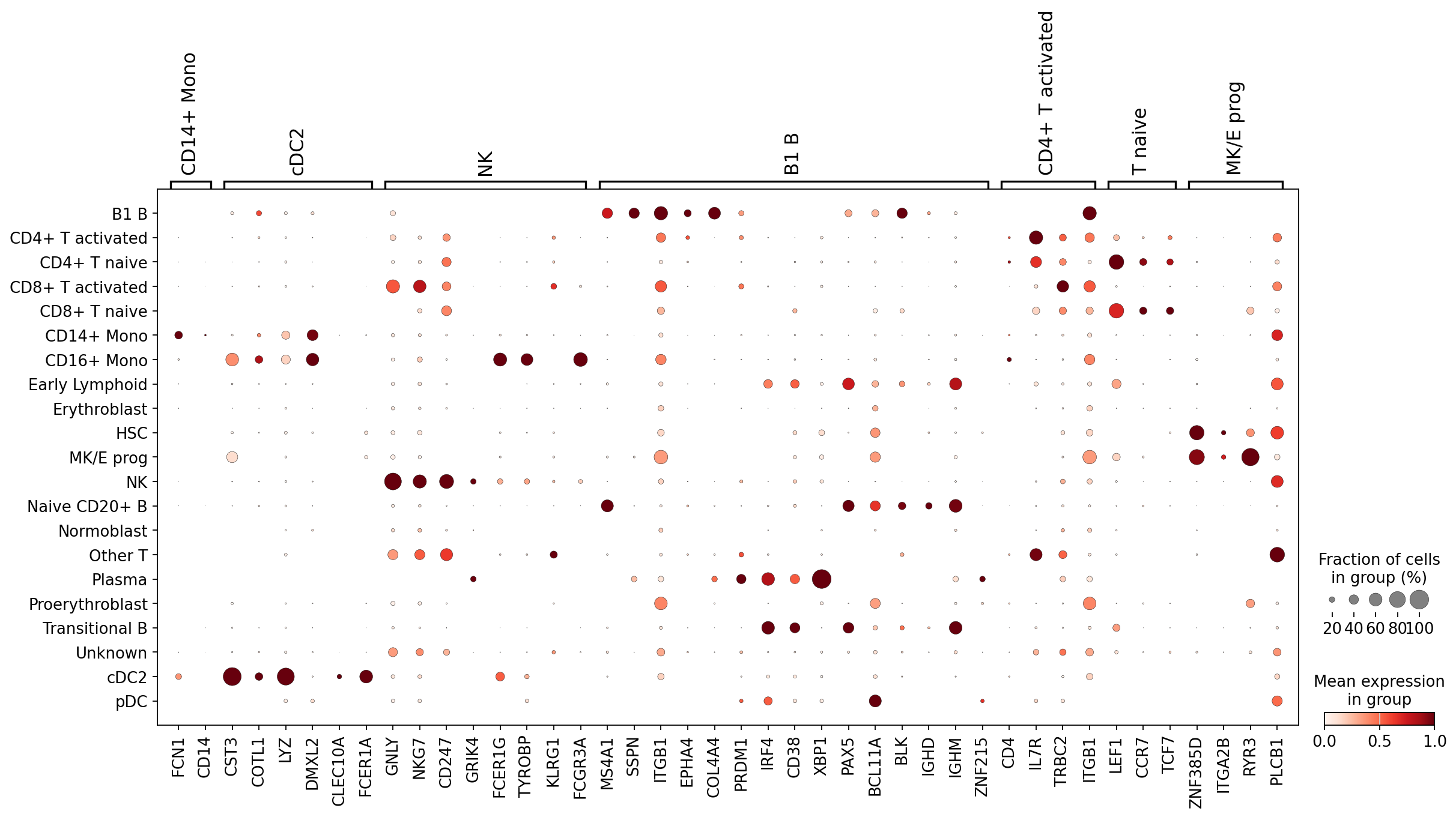 Let’s get started with the known-marker based approach. We will first list a set of markers for cell types in the bone marrow here that is based on literature: previous papers that study specific cell types and subtypes and report marker genes for those cell types. Note that markers at the protein level (e.g. used for FACS) sometimes do not work as well in transcriptomic data, hence using markers from RNA-based papers is often more likely to work. Moreover, sometimes markers in one dataset do not turn out to work as well in other datasets. Ideally a marker set is therefore validated across multiple datasets. Finally, it is often useful to work together with experts: as a bioinformatician, try to team up with a biologist who has more extensive knowledge of the tissue, the biology, the expected cell types and markers etc.