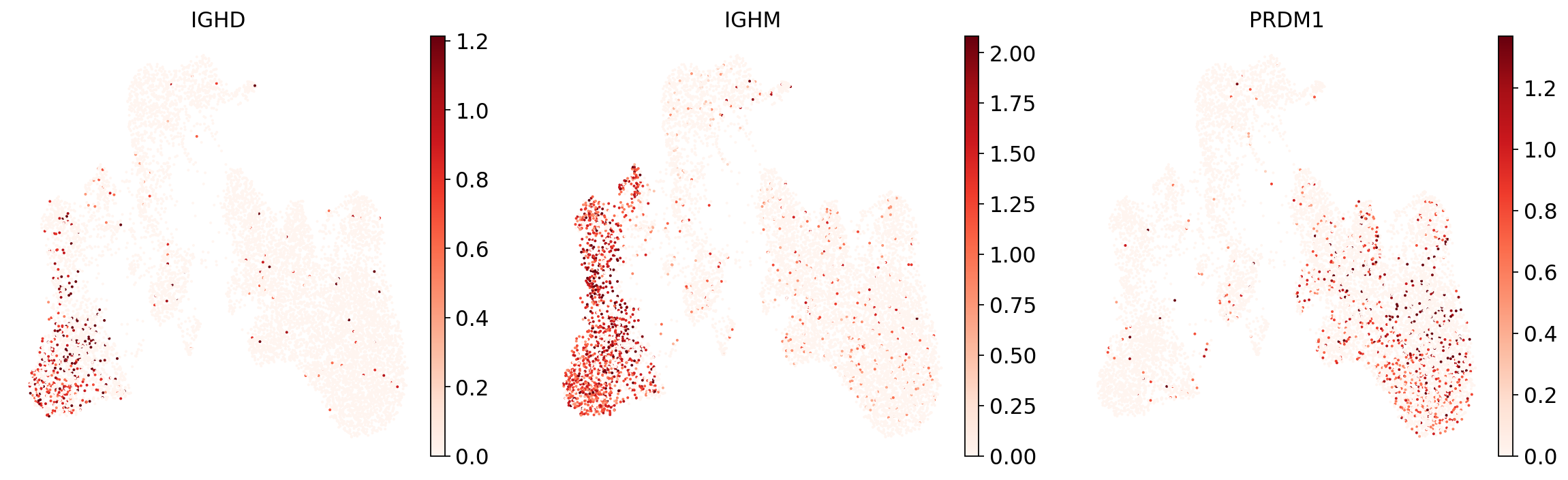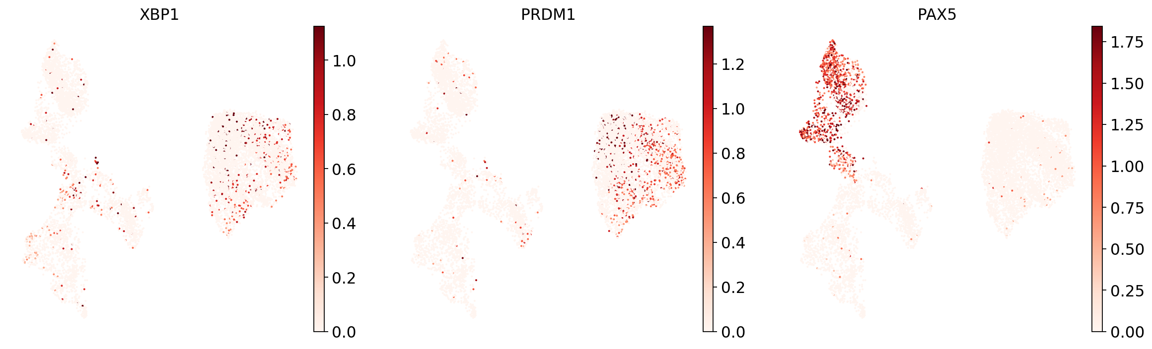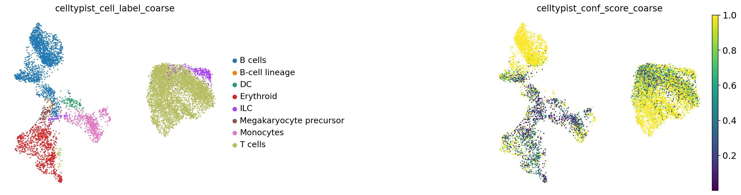 You’ll notice that e.g. progenitor cells are often more difficult to distinguish than other cell types. Same for the rather unspecific category “Other T” cells in our annotations. All the way on the right we see pDCs, a cell type that is known to be quite transcriptionally distinct and therefore easier to recognize and label.