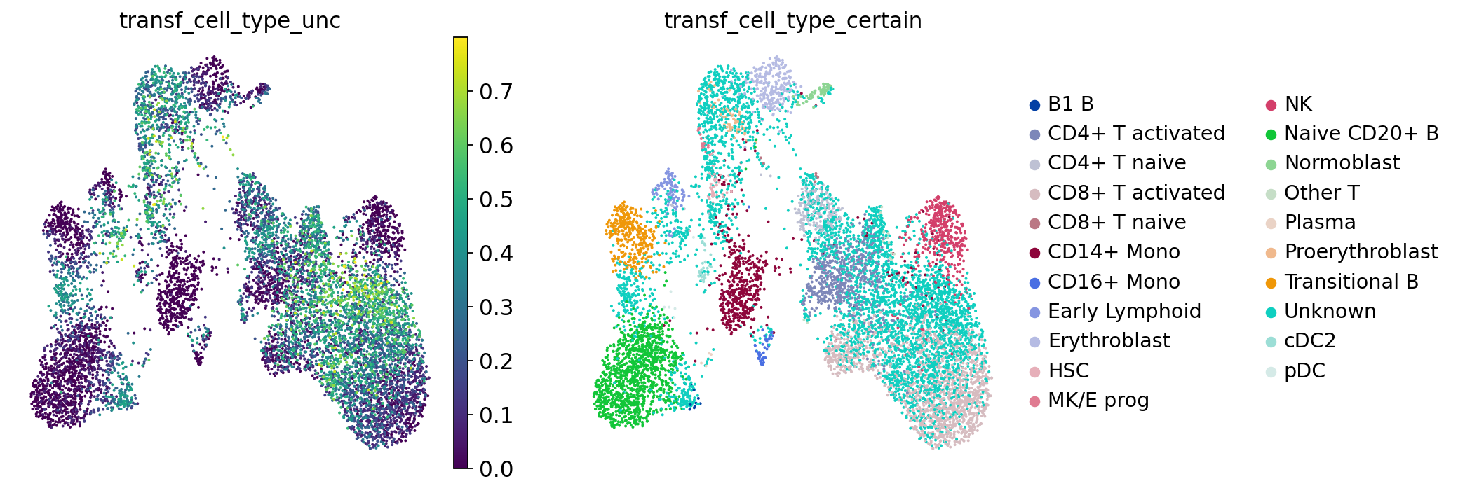 The uncertainty not only helps us identify regions where the algorithm is uncertain about which cell type a cell belongs to (e.g. because it falls in between two annotated phenotypes), but can also highlight unseen cell types or new cell states. For example, your reference might consist of healthy cells while your query could be from a diseased sample. The uncertainty score can then highlight disease-specific cell states, as they might not have neighbors from the reference that consistently come from a single cell type. Especially when your reference is based on a large set of datasets, the uncertainty score is useful to flag parts of the query data that could be interesting to look into. Reference-based label transfer thus not only helps you annotate your data, but can also speed up exploration and interpretation of your data. However, like any metric, these uncertainty scores are often not perfect and in some cases fail to highlight new cell types or states. For a more extensive discussion of uncertainty metrics, see e.g. [Engelmann et al., 2022].