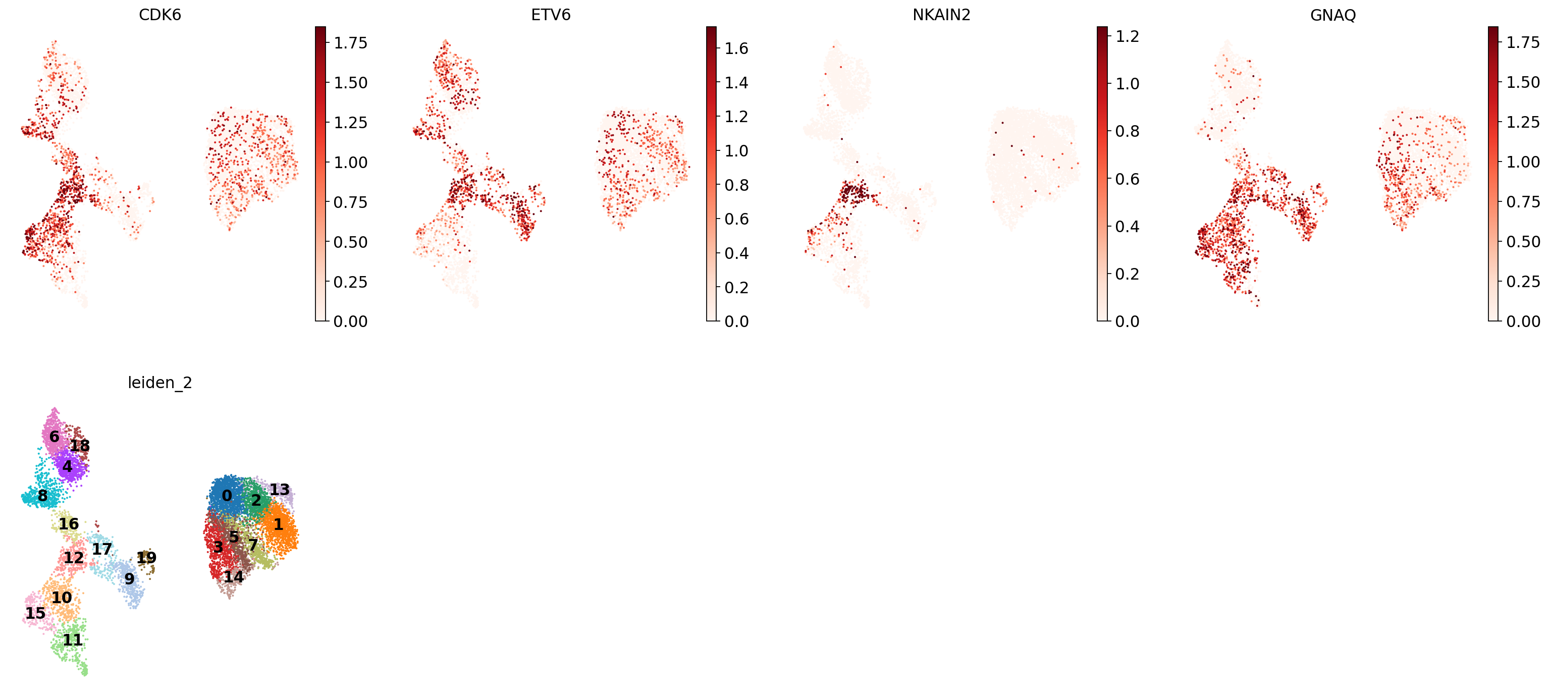 Finally, there are two angles from which to approach the marker-gene based annotation. One option is to work from a table of marker genes for all the cell types you expect in your data and check in which those clusters are expressed. The other option is to check which genes are highly expressed in the clusters you defined and then check if they are associated with known cell types or states. If necessary, one can move back and forth between those approaches. We will show examples of both below.