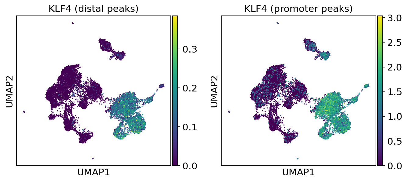 We can use the functionality of the ATAC module in muon to color plots by cut values in peaks corresponding to a certain gene.