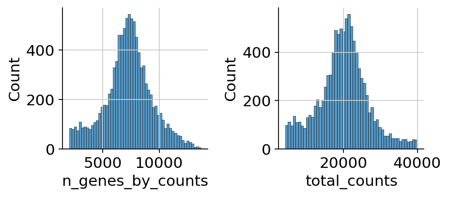 Although, we are now not working with RNA-Seq, it is possible to use some of scanpy’s preprocessing functions which can also be used on ATAC data. This is possible due to similar distribution and quality issues of both modalities. The only thing to bear in mind here that a gene would mean a peak in the context of the AnnData object with ATAC-seq data. Afterwards, ATAC specific preprocessing can be conducted with the ATAC module of muon.