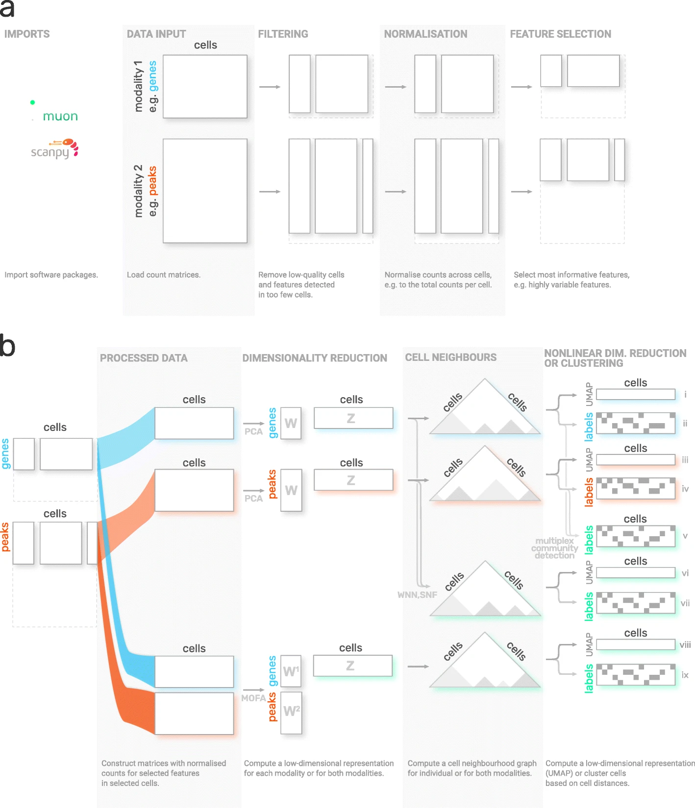 Although scanpy provides generally applicable tools such as PCA, UMAP and various visualizations, it is primarily designed for the analysis of RNA-Seq data. muon fills this gap by providing preprocessing functions for other omics such as chromatin accessibility (ATAC) or protein (CITE) data. As mentioned above, muon further provides algorithms to run multi-omics algorithms which infer knowledge from the joint modalities. For example, users may run a PCA on a single modality, but muon further provides multi-omics factor analysis algorithms which take several modalities as input.