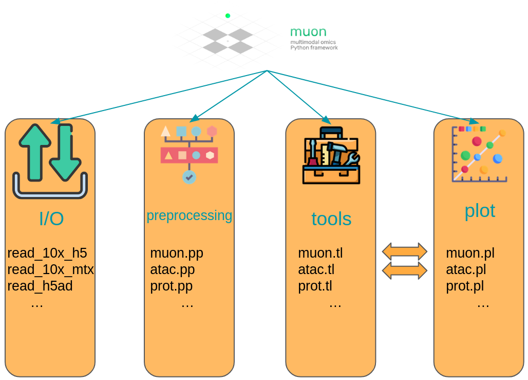 muon separates its modules in two ways. First, analogously to scanpy, general and multimodal functions are grouped in preprocessing (muon.pp), tools (muon.tl) and plots (muon.pl). Second, unimodal tools are available from the corresponding of muon, which are itself again separated into preprocessing, tools and plots. For example, all ATAC preprocessing functions are grouped into muon.atac.pp. This also applies to CITE-Seq preprocessing functions (muon.prot.pp).