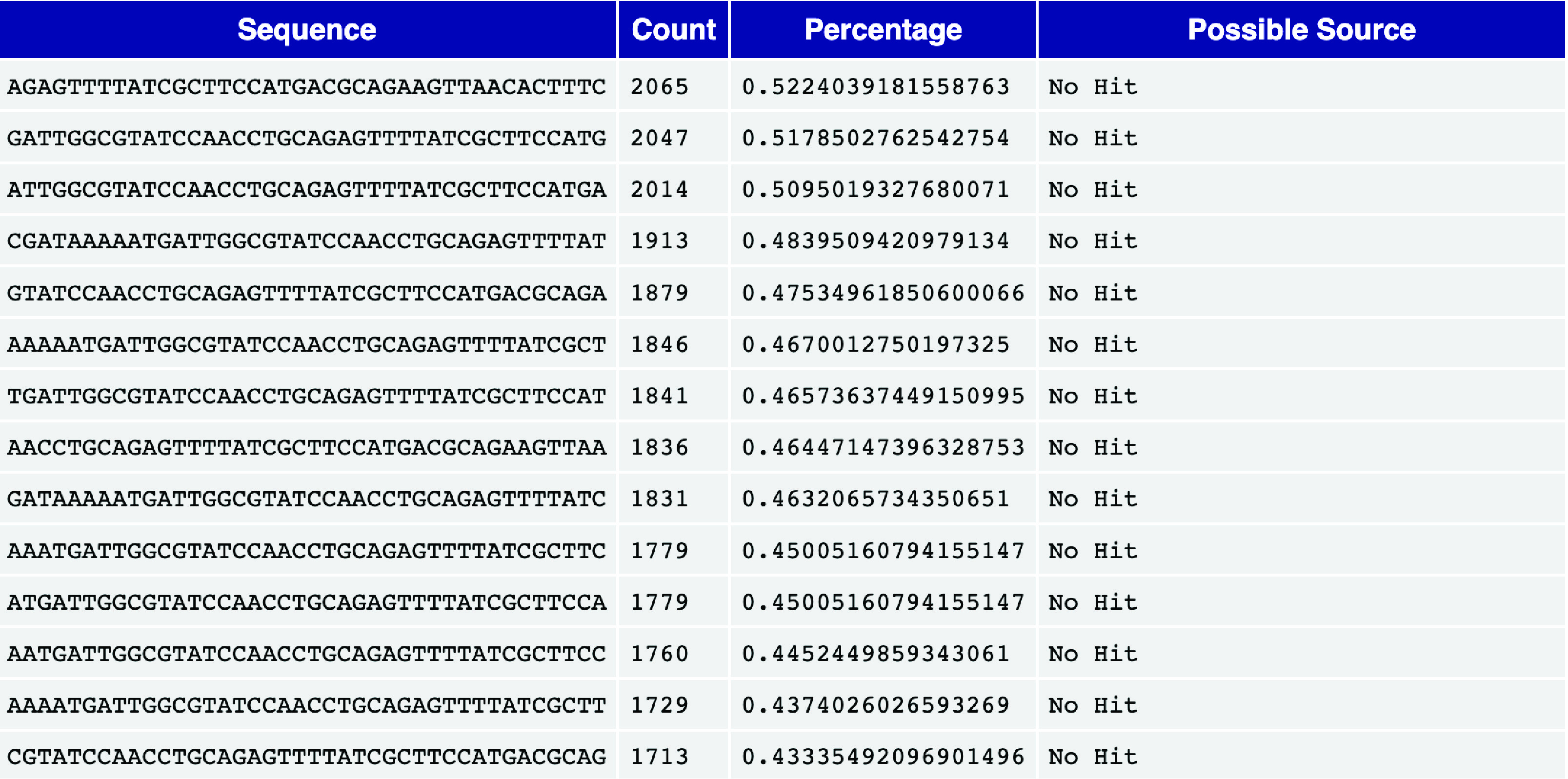 If the source of an overrepresented sequence is identified (i.e., not listed as “No Hit”), it could indicate potential contamination in the library from the corresponding source. Such cases warrant further investigation to ensure data quality.