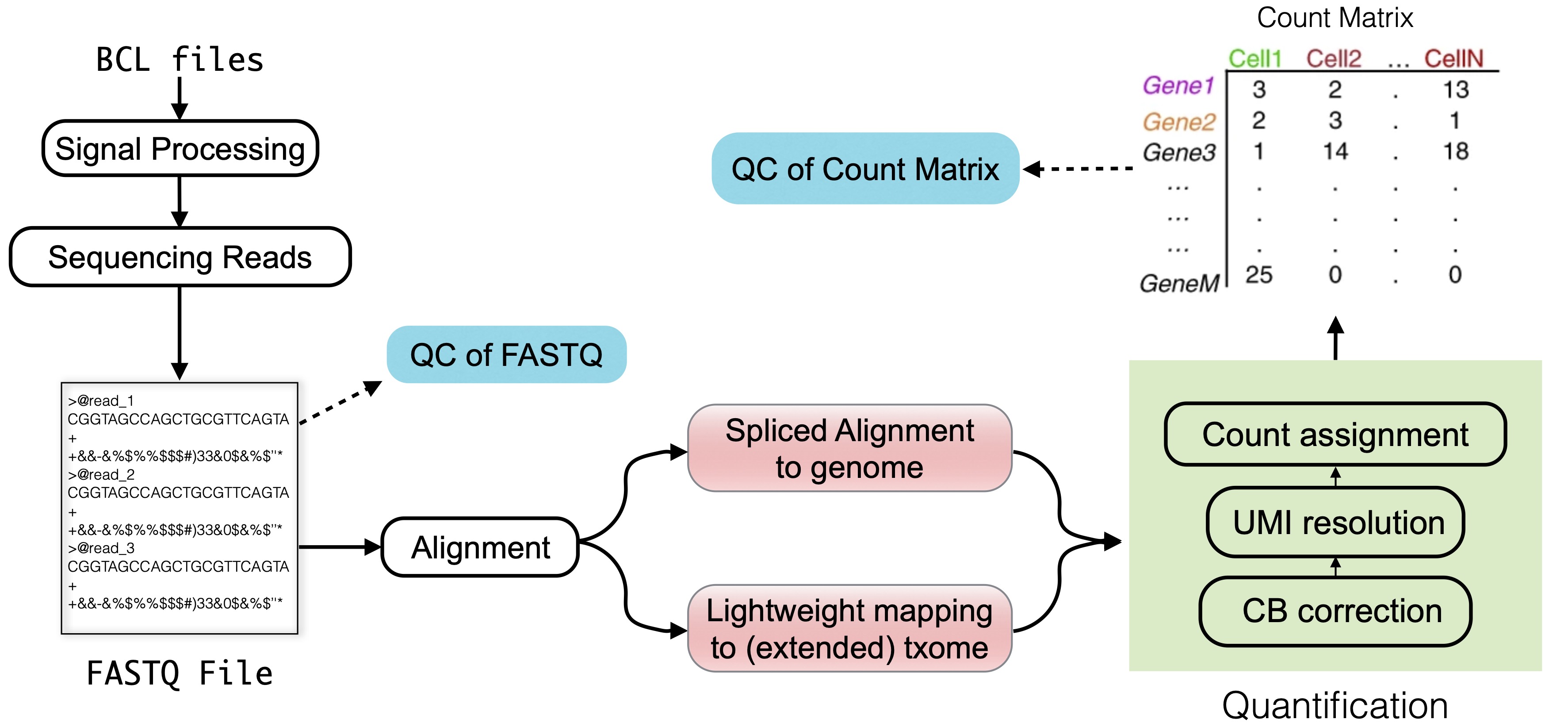 Here, we do not delve into the upstream processes, but consider the FASTQ files, derived from, e.g., BCL files via appropriate tools, as the raw input under consideration.