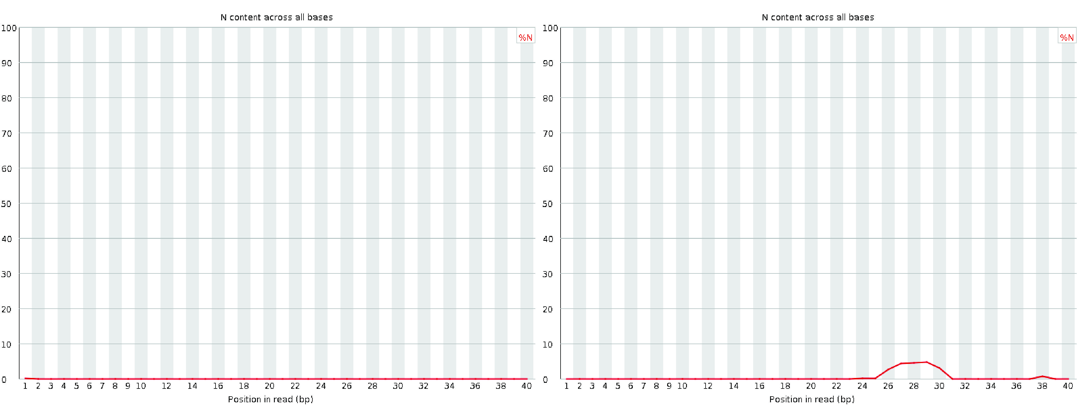 Fig. 3.9 A good (left) and a bad (right) per base N content plot.#