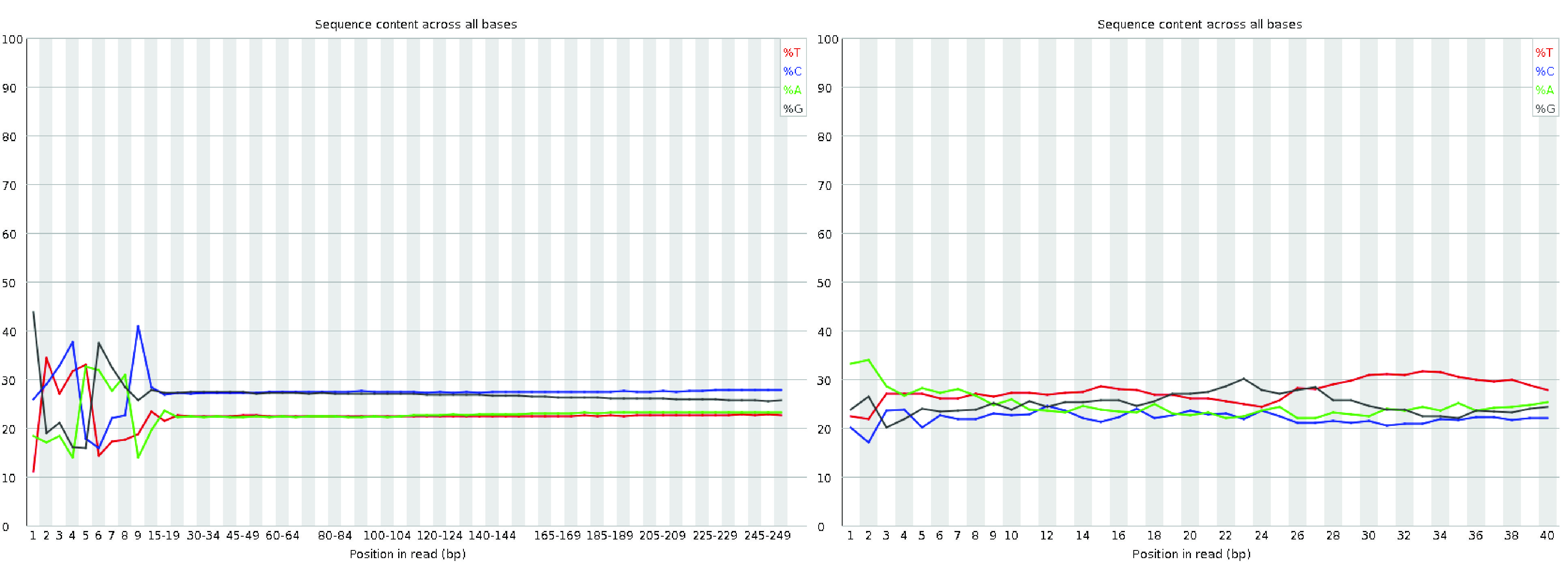 Fig. 3.7 A good (left) and bad (right) per base sequence content plot.#