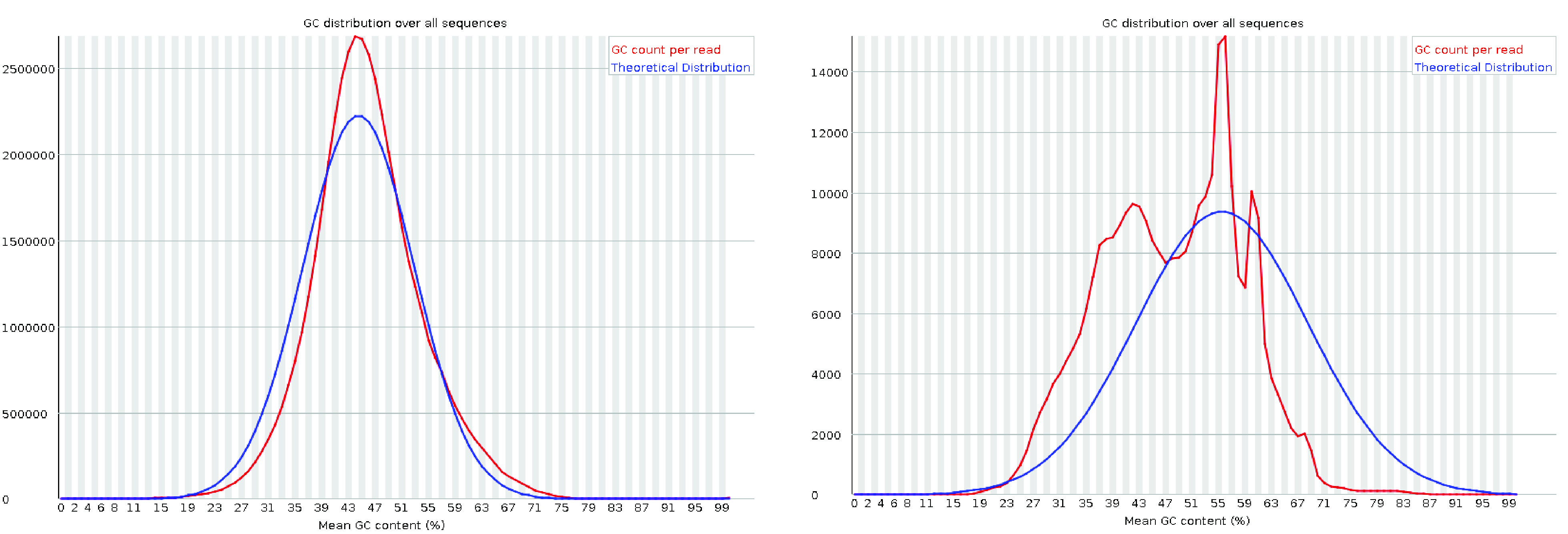 A complex or irregular distribution in this plot, however, often indicates contamination in the library. It is also important to note that interpreting GC content in transcriptomics can be challenging. The expected GC distribution depends not only on the sequence composition of the transcriptome but also on gene expression levels in the sample, which are typically unknown beforehand. As a result, some deviation from the theoretical distribution is not unusual in RNA-seq data.