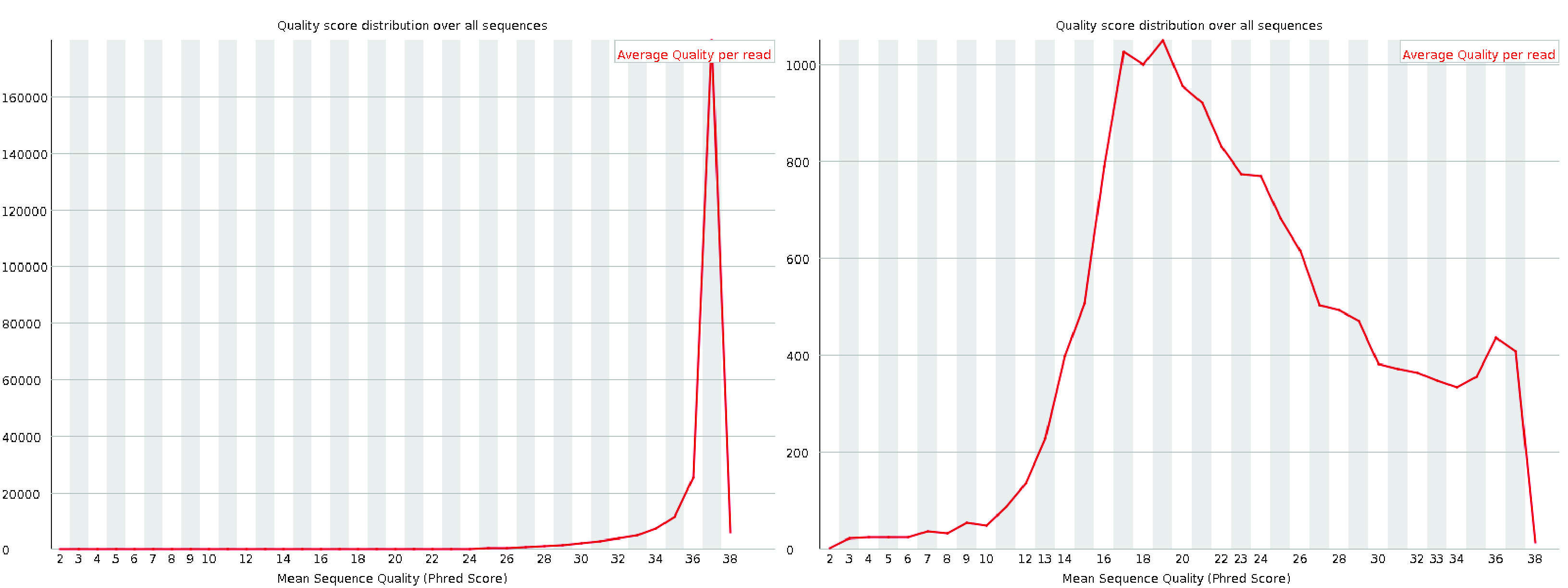 Fig. 3.6 A good (left) and a bad (right) per sequence quality score plot.#