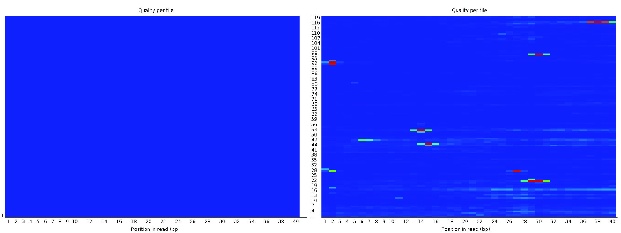 Fig. 3.5 A good (left) and a bad (right) per tile sequence quality view.#