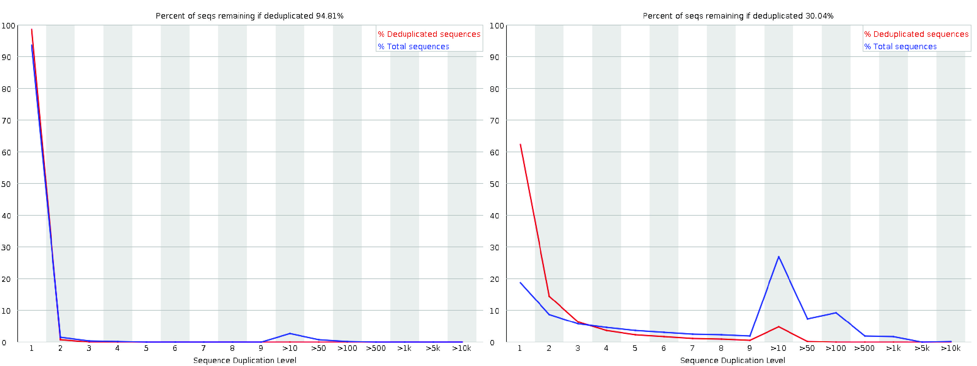 Fig. 3.11 A good (left) and a bad (right) per sequence duplication levels plot.#