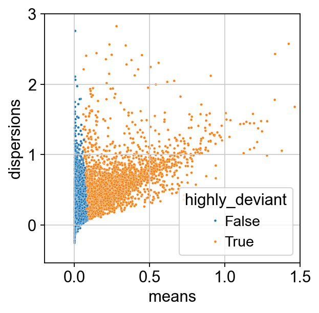 We inspect our results by plotting dispersion versus mean for the genes and color by ‘highly_deviant’.