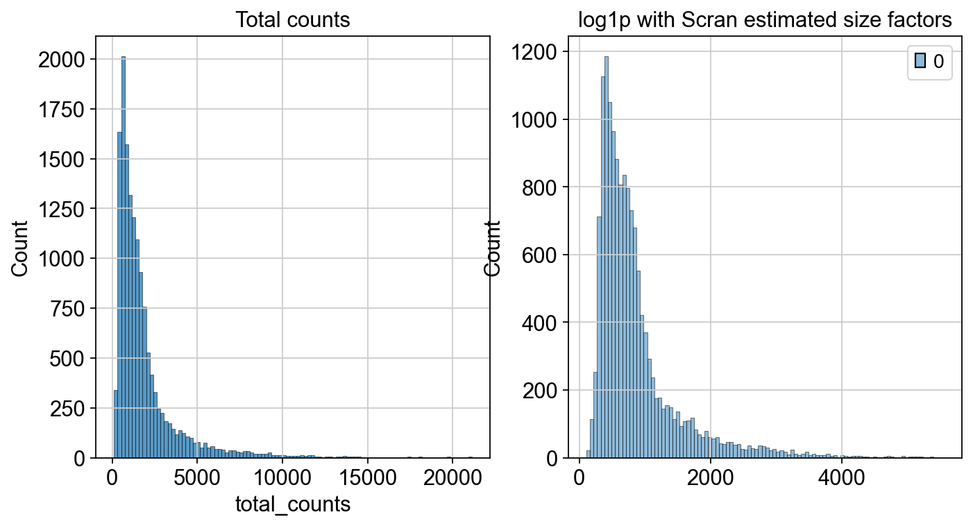 axes[1].set_title("log1p with Scran estimated size factors")