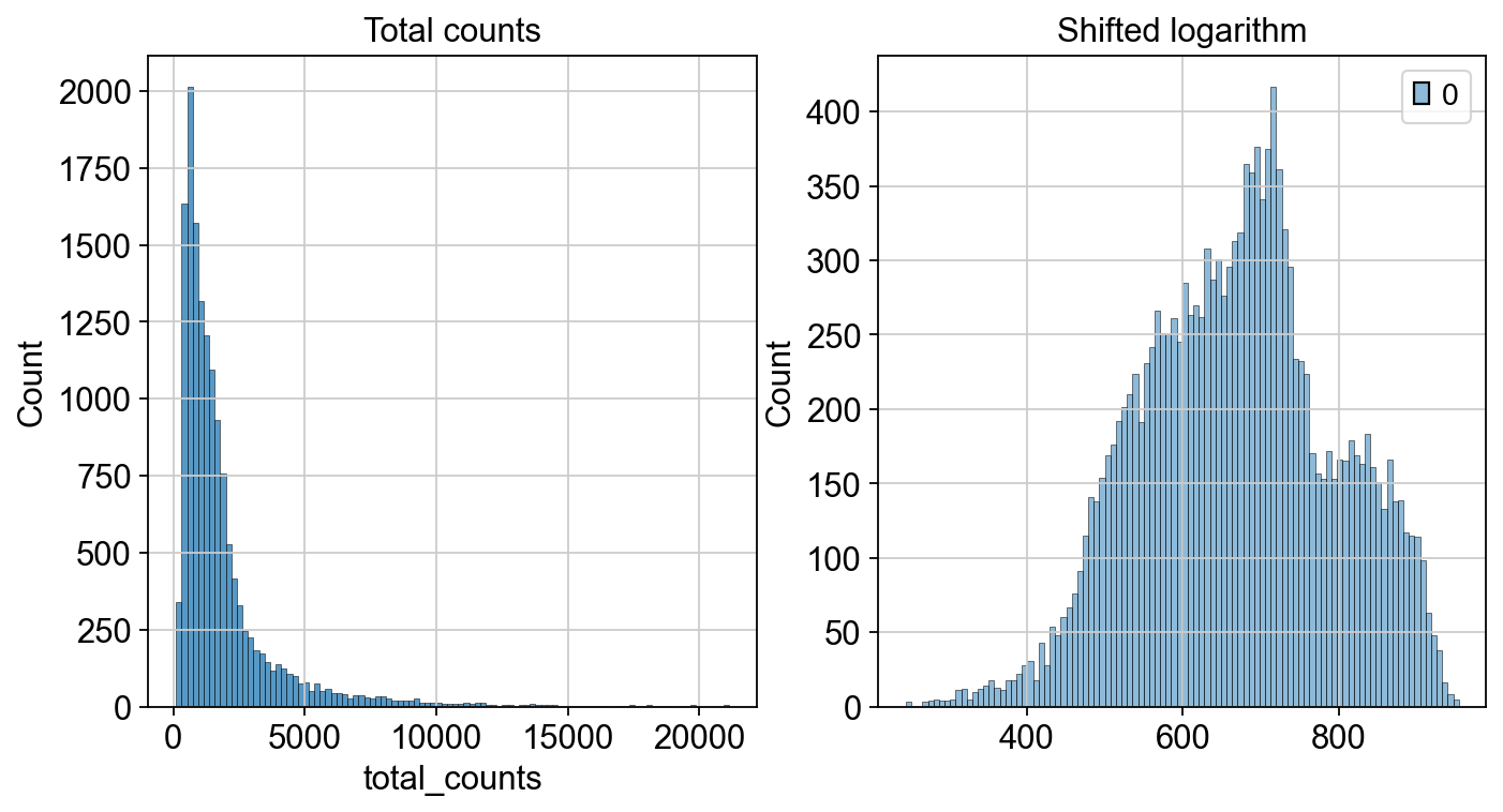 We can now inspect how the distribution of our counts changed after we applied the shifted logarithm and compare it to the total count from our raw (but filtered) dataset.