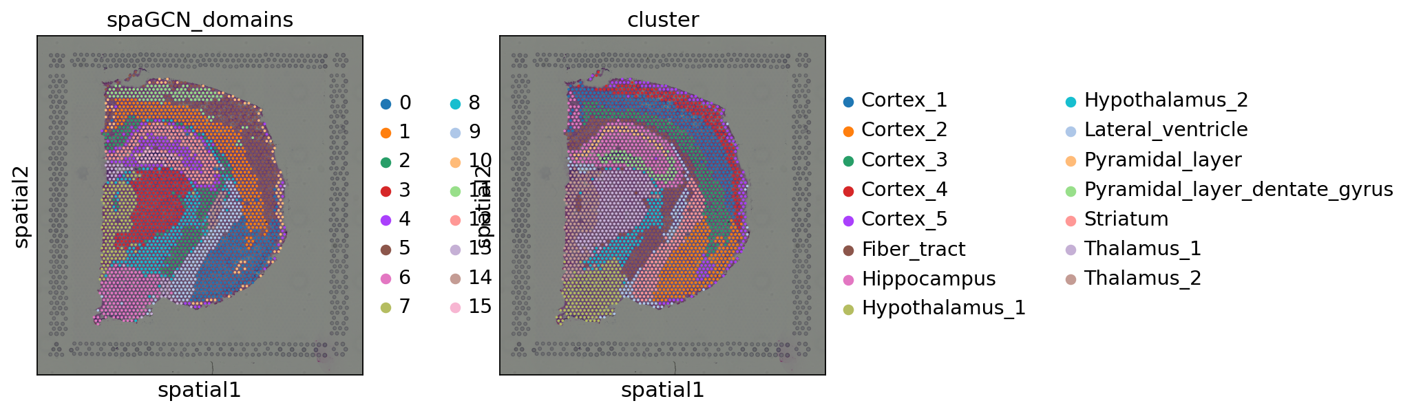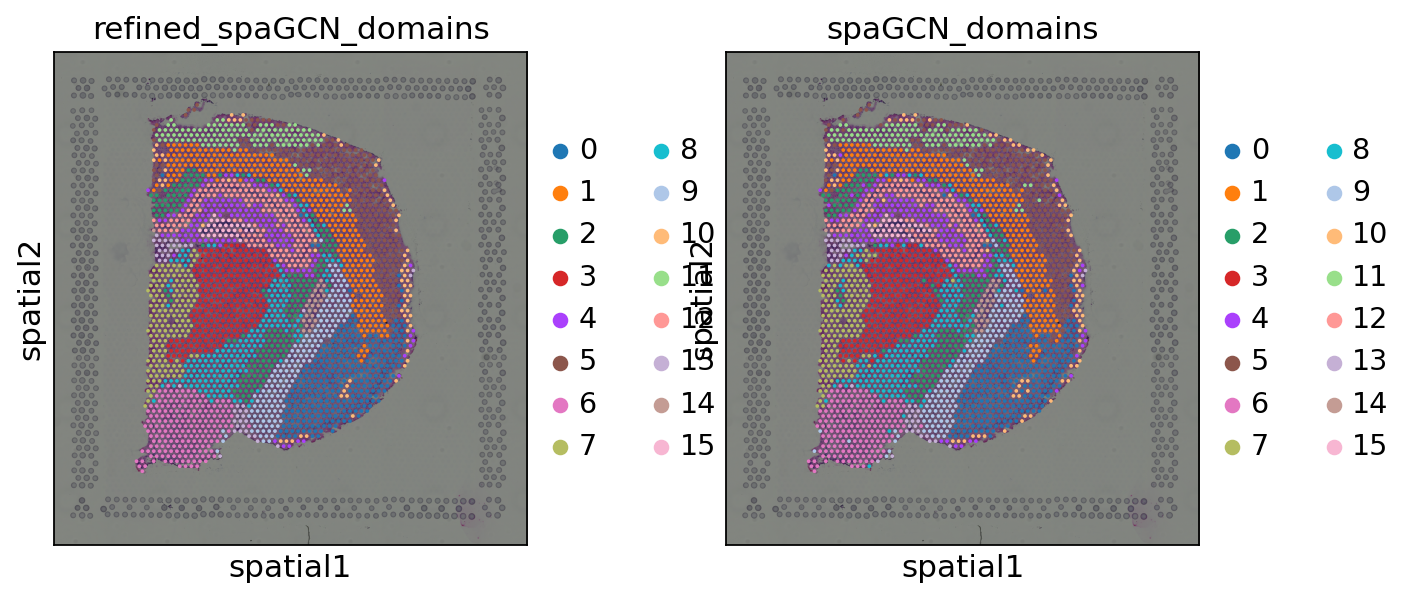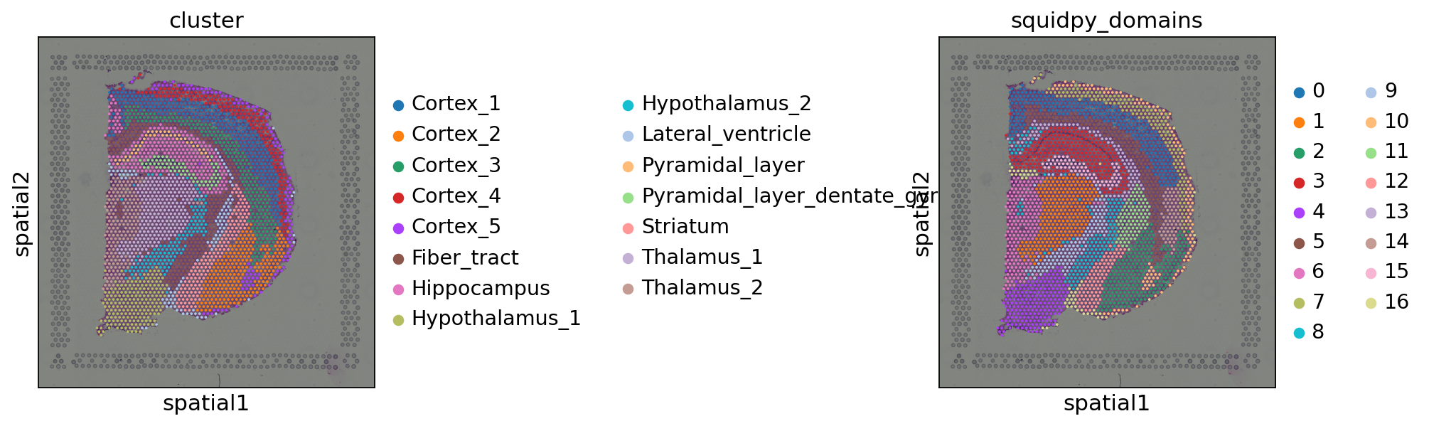 In this notebook, we will show how to calculate spatial domains in Squidpy and how to apply spaGCN.