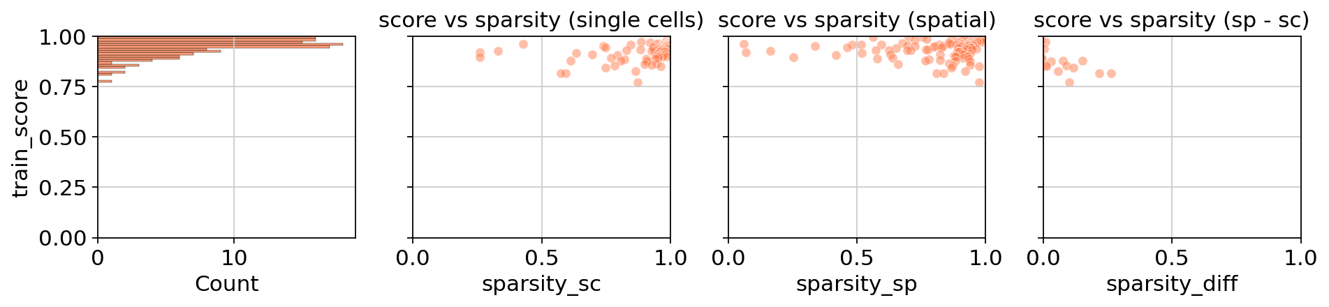 The score generally measures the similarity between original measurement (by the spatial technology) and the inferred mapping by single-cell data. The middle panels both relate the sparsity of the respective data, single-cell and spatial, of a training genes (each dot is a training gene) with the achieved score. As you can see, the performance is much more correlated with the spatial data which is often more sparse and therefore responsible for low-quality mappings. The last panel sets both technologies in context. Genes that have similar sparsity levels in both spatial and single-cell data usually achieve better scores than those that are inconsistent across technologies.