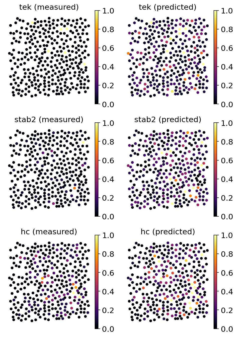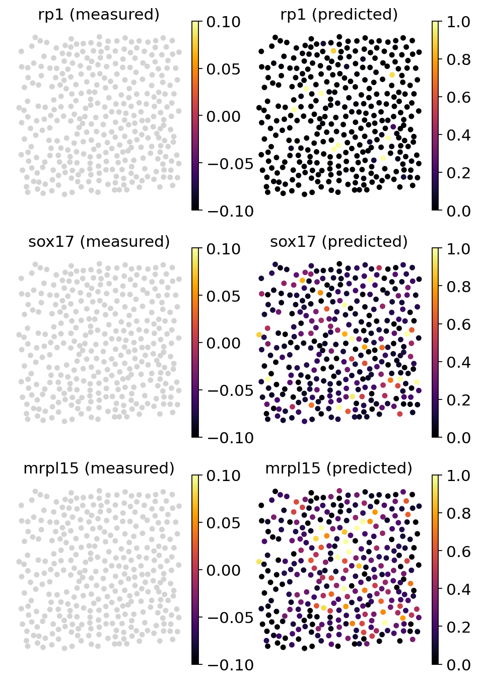 Next, we will compare the new spatial data with the original measurements. This will provide us with a better feeling why some training scores might be bad. Note that this explicit mapping of Tangram relies on entirely different premises than those in probabilistic models. Here, we are inclined to trust the predicted gene expression patterns based on the good mapping performance of most training genes. The fact the some genes show a very sparse and dispersed spatial signal can be understood a result of technical dropout of the spatial technology rather than a shortcoming of the mapping method.