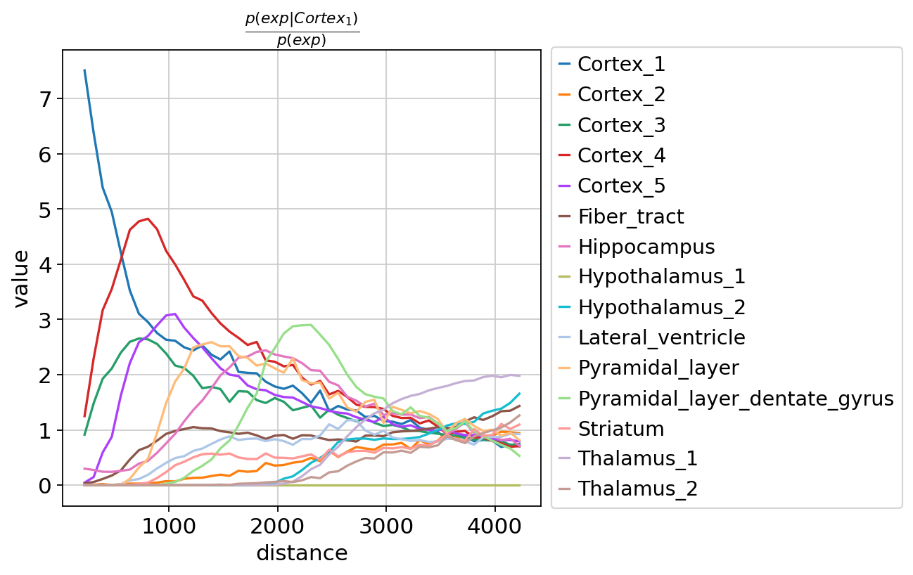 where \(p(exp|cond)\) is the conditional probability of observing a cluster \(exp\) conditioned on the presence of a cluster \(cond\) whereas \(exp\) is the probability of observing \(exp\) in the radius size of interest. The score is computed across increasing radii size around each observation (i.e. spots here) in the tissue.