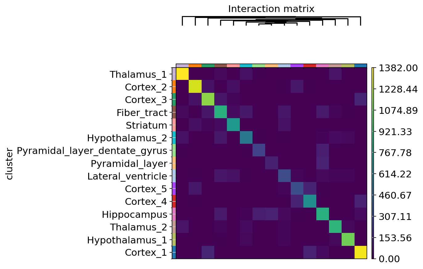 A similar approach to such problem is computing what we call an interaction matrix, that is, the sum of all connecting observations between clusters in tissue. The approach is related to the neighborhood enrichment analysis yet it is not a test, but should be viewed as a simple summary statistics of the spatial graph. Let’s take a look at how the interaction matrix looks like for the dataset.