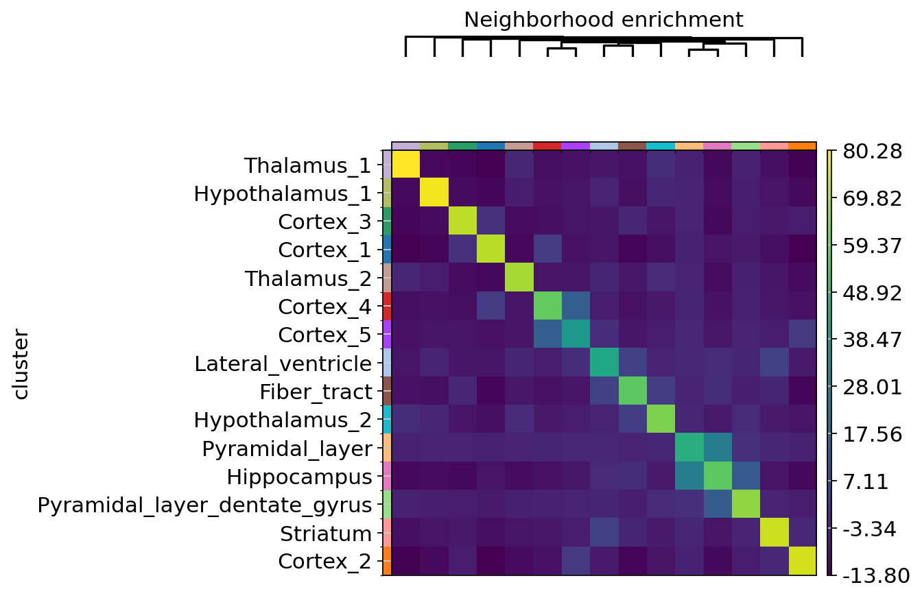 We can now run the neighborhood enrichment test by providing the annotation key in adata.obs.