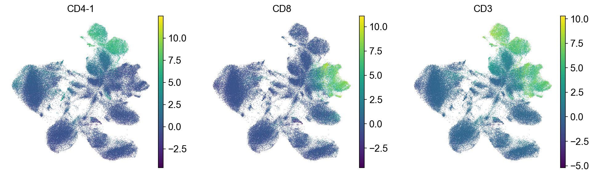 We check the expression of a few marker genes to confirm that separate cell types are still separate from each other. We can see that T cells still form a separate population that is further split into CD4 and CD8 T cells.