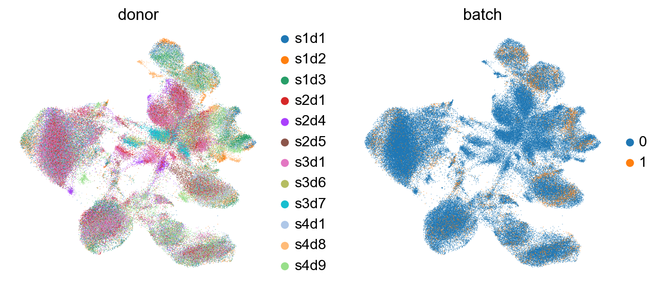 As we can see here, the cells of different donors are much more intermixed in the embedding than before.
