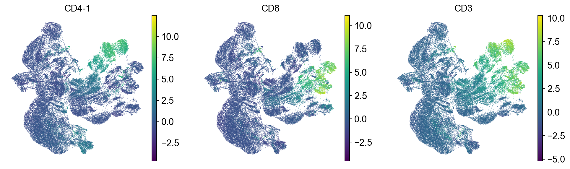 Feature matrices of surface protein markers are hard to grasp for humans as raw tables. Therefore, we resort to low dimensional embeddings that allow us to visualize the ADTs in commonly two dimensions. The approaches that we use and recommend for ADT data do not differ from the ones for transcriptomics data. All aforementioned limitations of visualizations obtained through methods like t-SNE and UMAP also apply to ADT data.
