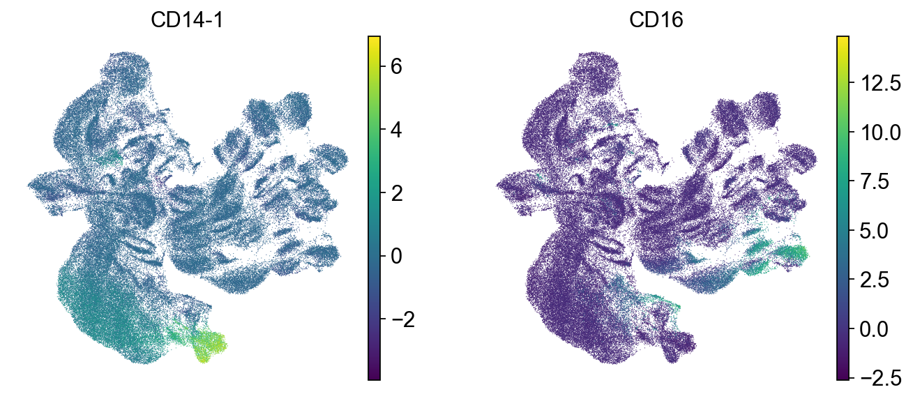 sc.pl.umap(mdata["prot"], color=["CD14-1", "CD16"])