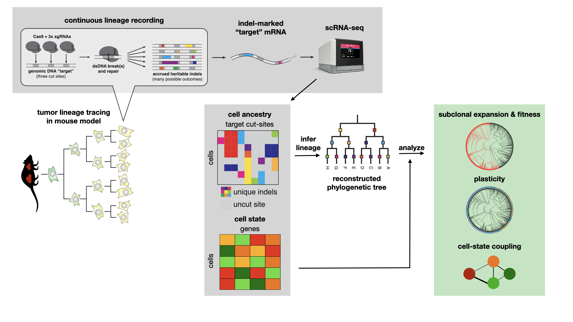 With this system, the authors followed tumors from their single-cell origins over the course of approximately 4.5-6 months at which point they harvested aggressive, metastatic tumors. After dissociation of the tumors, the authors profiled both the lineage tracing target sites and the RNA content of single cells. This resulted in a large dataset of more than 70,000 cells across more than 100 tumors with both lineage and scRNA-seq information.