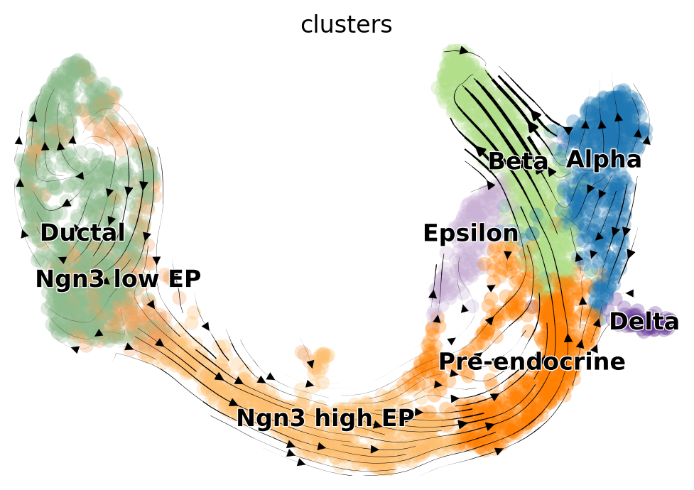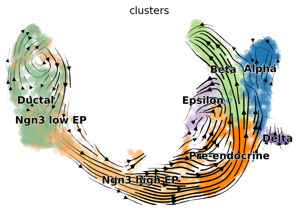For a practical example of how RNA velocity can be inferred, we analyze the endocrine development in pancreas [Bastidas-Ponce et al., 2019]. In this system, pre-endocrine cells (Ductal, Ngn3 low EP, Ngn3 high EP, Pre-endocrine) develop into four endocrine cell types (Alpha, Beta, Delta, Epsilon). Here, we use scVelo [Bergen et al., 2020] to infer RNA velocity.