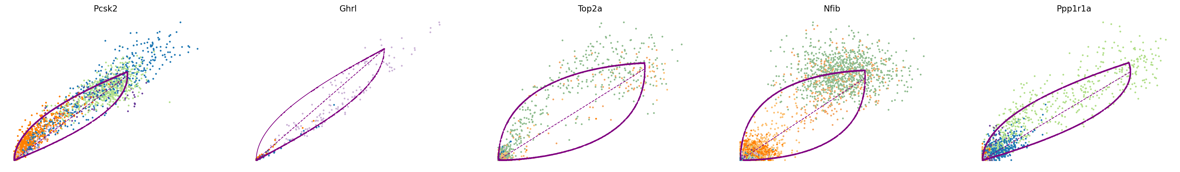 The parameters of the splicing model are inferred by maximizing a given likelihood. To study which genes were fit most confidently by scVelo, we can study the corresponding phase portraits as well as the inferred trajectory (plotted in purple) and steady-state ratio (dashed purple line). Here, three out of the five shown genes (Pcsk2, Top2a, Ppp1r1a) exhibit phase portraits in a (partial) almond shape. We observe a clear transition either within a single cell type (Top2a, Ppp1r1a) or across several cell types (Pcsk2, from Pre-endocrine to Alpha and Beta). In the case of Nfib, we observe two cellular populations in steady state. This most likely an artifact of undersampling the phenotypic manifold around Ngn3 low/high EP cells. Similarly, Ghrl is highly expressed in Epsilon cells although only a few due to the small cluster size. While current best practices are limited to analysing model fits and the confidence therein by hand, recently proposed methods can help automate the process (New directions). Here, Nfib abd Ghrl would be assigned with a lower confidence score.