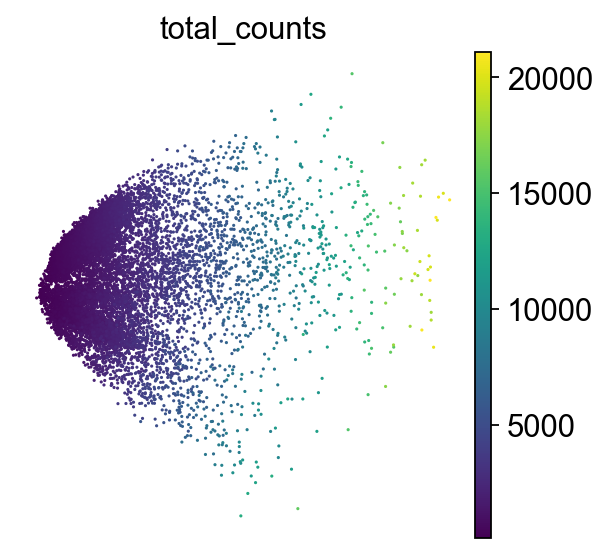 Points: Each point represents a single cell. Color represents the total number of transcripts (UMIs) detected in that cell.