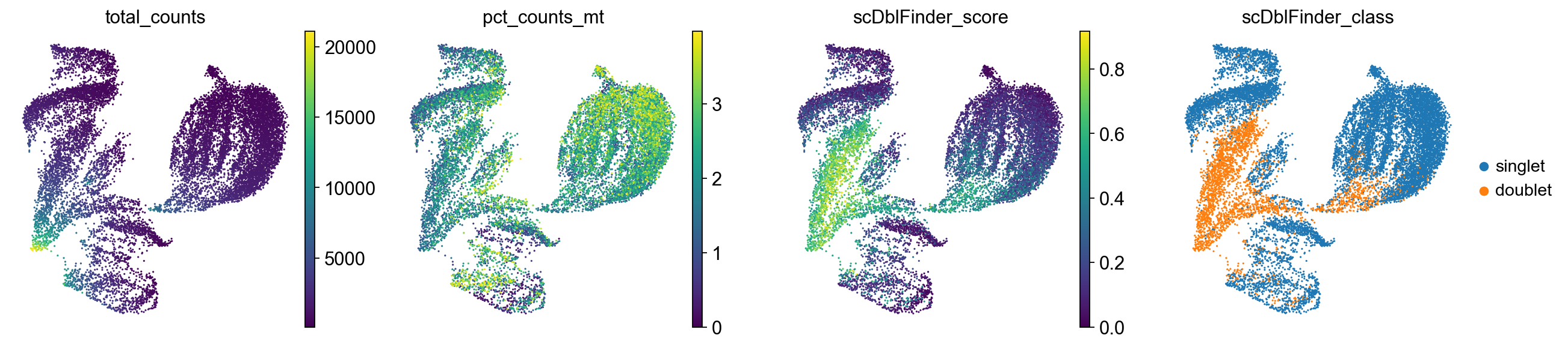 color=["total_counts", "pct_counts_mt", "scDblFinder_score", "scDblFinder_class"],